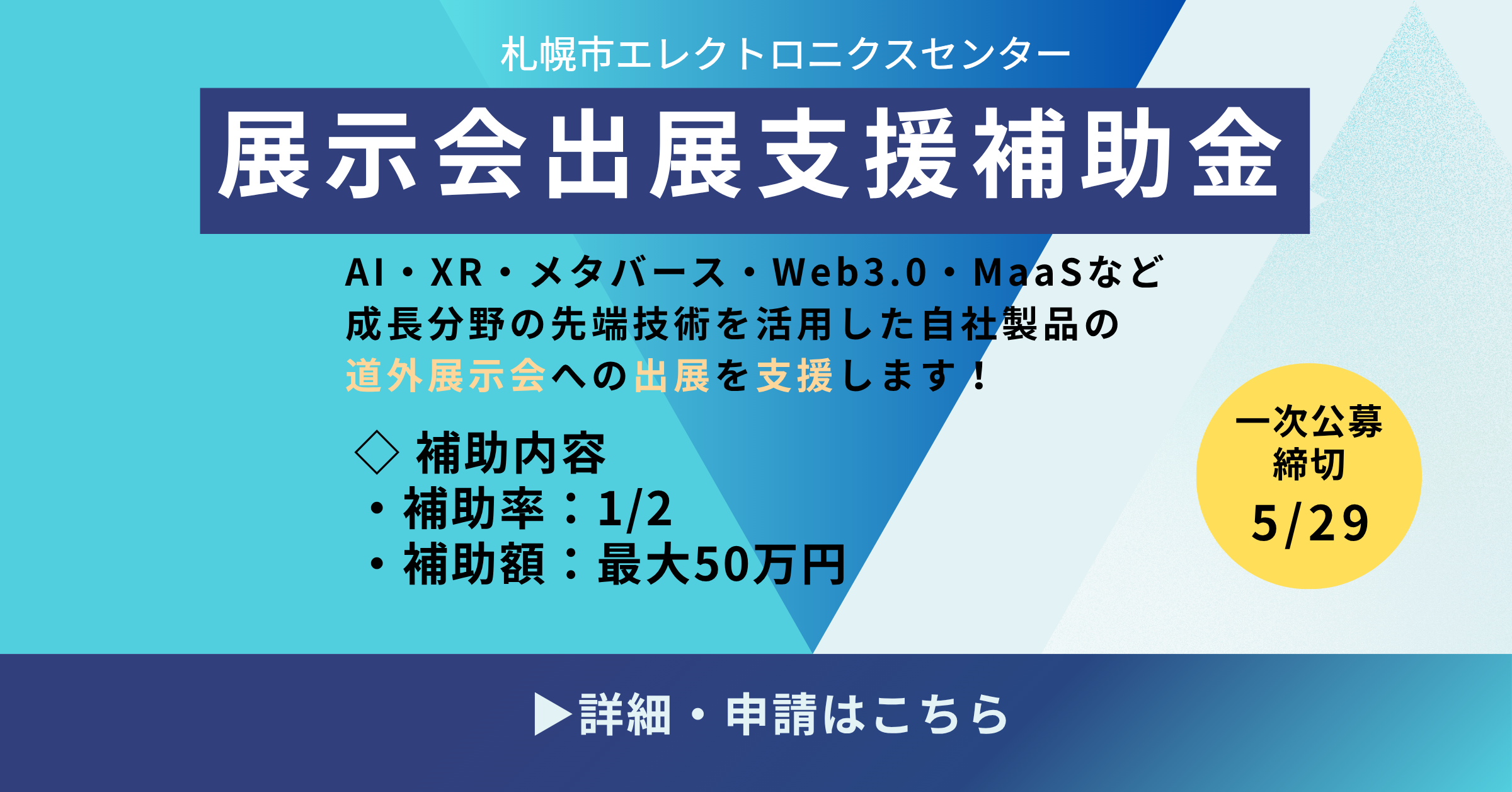 当財団では、札幌市内のIT企業の競争力強化および成長市場の開拓を目的として、「展示会出展支援補助金」の公募を開始いたしました。 本補助金は市内IT事業者を対象に、AI、XR、メタバース、web3.0、MaaS等、今後さら […]